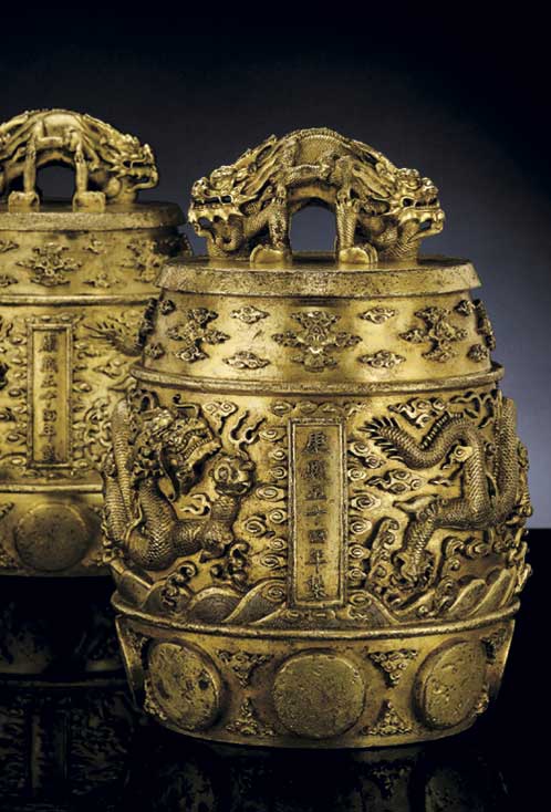 清康熙御製鎏金銅交龍鈕雲龍紋 「無射」、「夾鐘」編鐘各一枚 鑄《康熙五十四年製》楷書銘款 香港佳士得於2009年5月27日拍出 成交價:4,546萬港元 (5,850,702美元) |